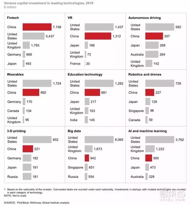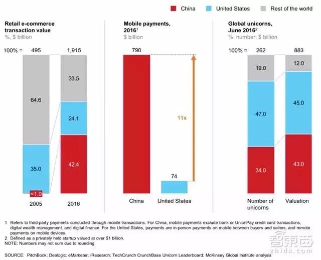报告显示,中国电子商务(2016年交易额占全球40%)和数字支付(2016年个人消费交易额交易额7900亿美元,是美国的11倍。)已经领先全球;独角兽公司数量占的1/3,独角兽价值约占全球43%;2014至2016年间风投金额达770亿美元(占全球19%)。