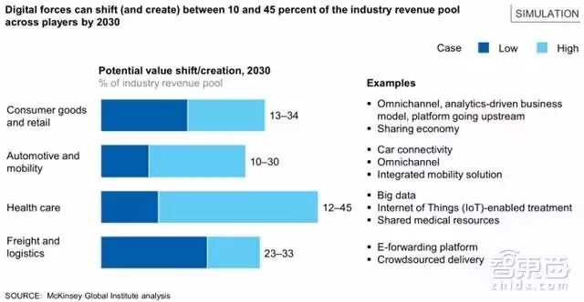 到2030年,基于这三者的数字经济(消费和零售、汽车和移动、医疗健康、货运和物流)或可转变并创造10-45%的行业总收入。