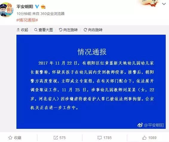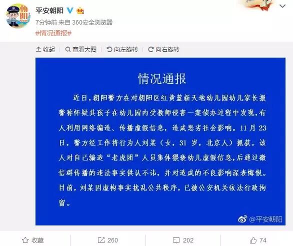 11月25日傍晚,北京市公安局朝阳分局通过官方微博发布对红黄蓝新天地幼儿园有关情况的通报。