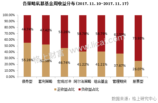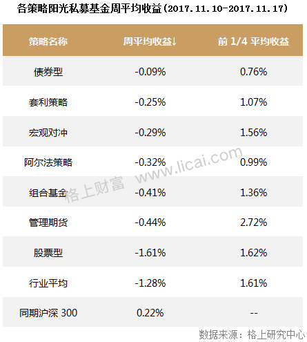 从各策略业绩表现来看,上周(2017.11.10-2017.11.17)所有策略均表现不佳,全部取得周度负收益。其中,跌幅最小的是债券策略,周平均收益为-0.09%,表现最差的是股票型策略,仅有26.07%的产品取得了正收益,整个策略周平均收益为-1.61%。管理期货表现分化,前1/4平均收益为2.72%,是所有策略中表现最好的。
