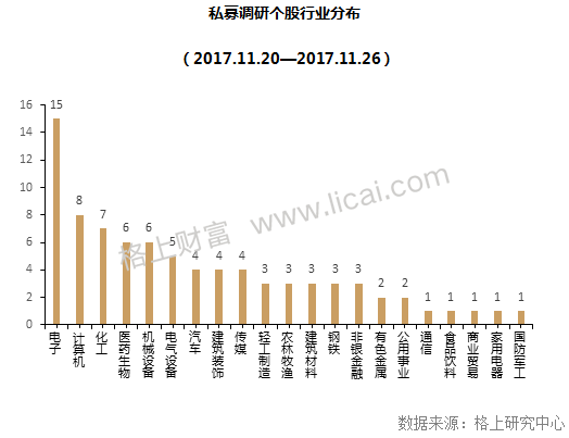 板块方面,本周中小板关注度最高为45.78%,其次为创业板,关注度为33.73%。行业方面,电子行业连续4周受到最多关注,本周有15家上市公司被调研,其次受到最多关注的是计算机行业,上周备受关注的医药生物本周出现降温,只有6只个股被调研,数目为上周的一半。