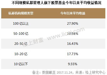 2017年以来,股市呈现白马股大蓝筹的行情,截至上周五(11月24日),上证50涨幅28.42%,沪深300上涨22.60%,与股市相关度较高策略,如股票策略、定增策略、组合基金表现持续良好,股票型基金在各类基金中收益持续领先。在这种市场环境下,到底是哪种规模类型的私募机构表现更优,规模是否构成业绩的“杀手”?