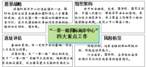 国际离岸中心的设立和运行,应重点做好中心的愿景战略、组织架构、选址评估和风险防范等四项重点工作。