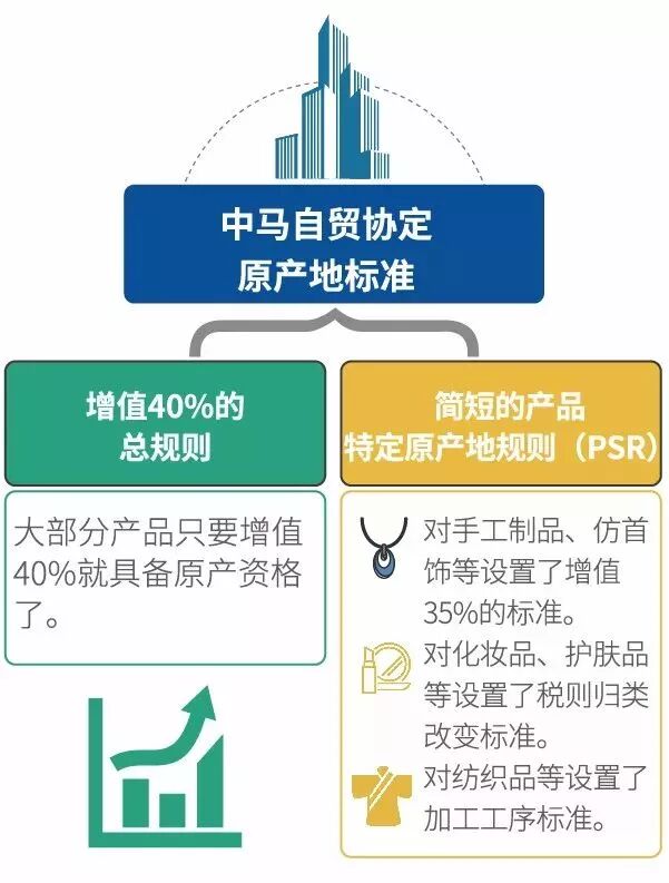 中马自贸协定使用了增值40%的总规则和简短的产品特定原产地规则(PSR)相结合的灵活方式制定原产地标准。