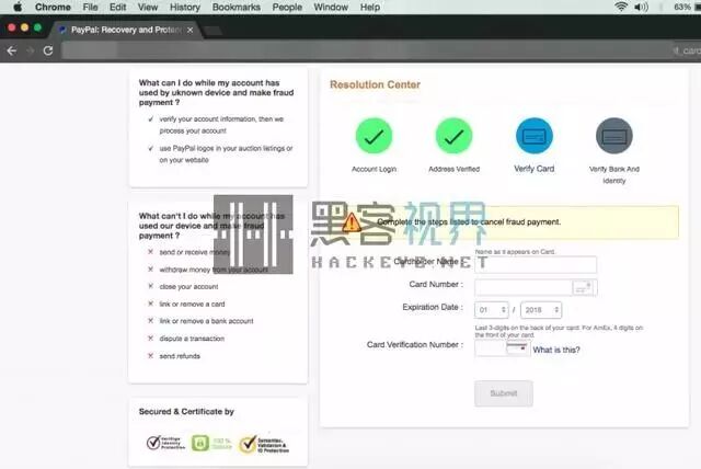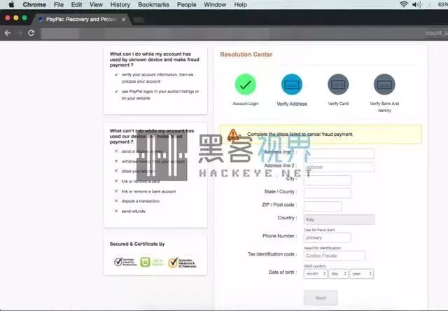 对于Chrome浏览器用户来说,这里有个好消息,Chrome浏览器会将骗局中出现的网站标识为危险网站。HackRead也建议PayPal用户应该保持警惕,真实的PayPal官方网站有一个经过验证的绿色签名,如下面的截图所示:
