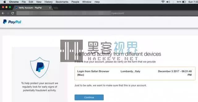 一旦用户点击了电子邮件中的链接,将进入一个异常活动提醒页面。页面显示有一条账户的异地登录信息,并要求用户确认这个登录操作是否来自本人。如果不是,则需要点击“继续(Continue)”来对自己的账户进行修改。