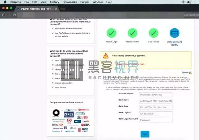 在点击“提交(Submit)”按钮后出现的一下个页面中,用户被要求验证他们的银行账户,包括开户银行名称、银行卡号、银行代码、银行登录帐号和密码。