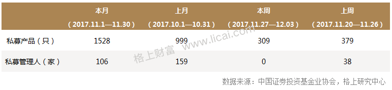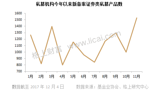 今年以来,监管层频频出台私募行业相关法规制度,近期人行、银监会、证监会、保监会、外汇局联合发布《关于规范金融机构资产管理业务的指导意见(征求意见稿)》。《指导意见》规定了合格投资者门槛,明确了私募杠杆比例,限制了多层嵌套和通道业务等,对私募行业有着深远影响,可以说今年私募行业又经过了一轮洗牌。在强监管下,格上研究中心发现私募基金的发行热情却在不断走高。基金业协会备案数据显示,截至2017年12月4日,11月份私募机构共备案新产品1528只,创今年以来的新高,环比上月增加了52.95%。