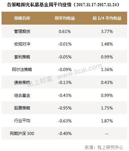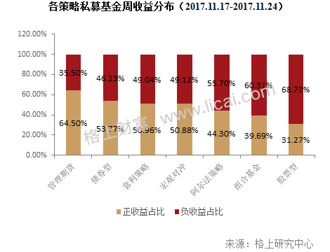 从各策略业绩表现来看,上周(2017.11.17-2017.11.24)各策略业绩普遍表现不佳,平均收益为-0.63%。其中,管理期货大幅领先其他策略位居榜首,周平均收益为0.61%,也是唯一一个获取到正收益的策略。受市场回调影响,股票策略排名最后,但是绩优产品收益1.75%,仅次于管理期货,说明同策略中业绩分化较为严重。