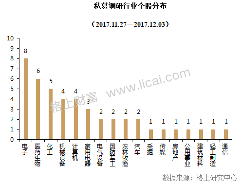 板块方面,本周创业板与中小板关注度持平,各占35.56%。行业方面,电子行业依旧受到最多关注,本周有8家上市公司被调研,其次是医药生物行业,有6家上市公司被调研。