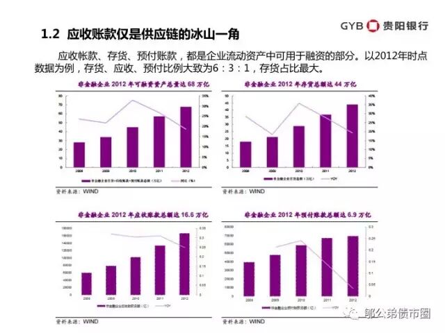 应收帐款、存货、预付账款,都是企业流动资产中可用于融资的部分。以2012年时点数据为例,存货、应收、预付比例大致为6:3:1,存货占比最大。