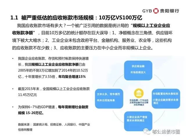 我国应收账款市场有多大?一个被广泛引用的数据是统计局的“规模以上工业企业应收账款净额”,目前10万多亿的统计额存在巨大误导:1、净额概念在三角债、供应链环境下被大大缩水;2、工业企业未包含政府平台、金融机构、服务业、农业等,这些机构的应收账款不在少数;3、应收账款的主要压力在中小企业而非规模以上企业。