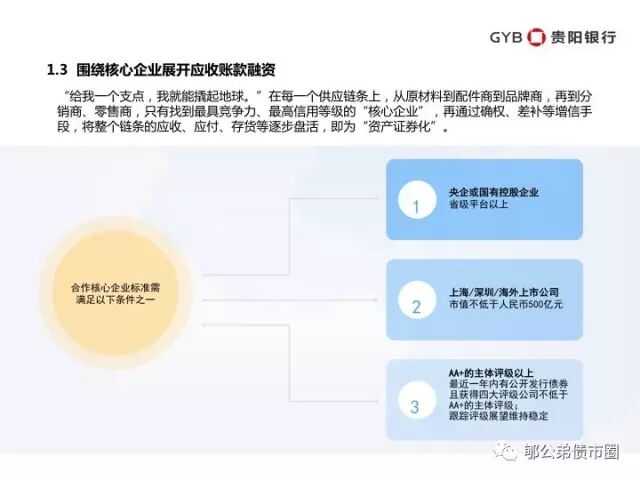 “给我一个支点,我就能撬起地球。”在每一个供应链条上,从原材料到配件商到品牌商,再到分销商、零售商,只有找到最具竞争力、最高信用等级的“核心企业”,再通过确权、差补等增信手段,将整个链条的应收、应付、存货等逐步盘活,即为“资产证券化”。