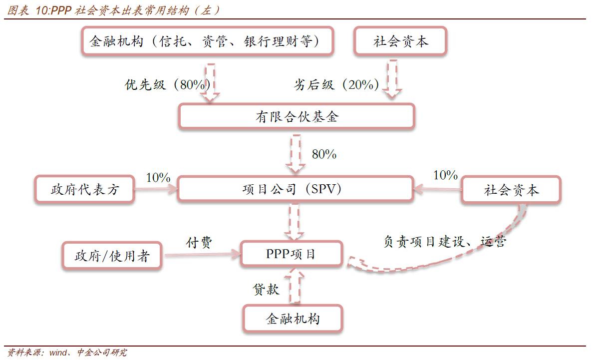 在PPP项目中,社会资本方参与了PPP项目的前期工作、建设、运营、移交等整个流程,对PPP项目具有实际上的控制权,理论上是最应该并表的股东,但实际操作中,社会资本方为了出表,往往会选择引入战略投资者共同参与PPP项目。战略投资者一般以金融机构为主,包括但不限于信托、券商资管、资管计划、银行理财等类型,他们和社会资本共同组成有限合伙基金。有限合伙基金一般采用结构化设计,金融机构充当优先级积极,按照合同约定获取固定回报,社会资本充当劣后级。从股权控制来看,战略投资者往往占大头,对PPP项目公司具有名义上控制权,社会资本和地方政府对PPP项目的股权比例相对较低,最终PPP项目进入战略投资者的资产负债表中。但国资委新发的192号文指出,社会资本方应该按照“实质重于形式”原则,综合判断对 PPP项目的控制程度,规范界定合并范围。如果按照“实质重于形式”的原则,PPP项目将需要并入社会资本方的表中,考虑到PPP项目金额一般较大,在目前主要央企资产负债率已经偏高的背景下,此举将会降低央企参与PPP项目的热情。
