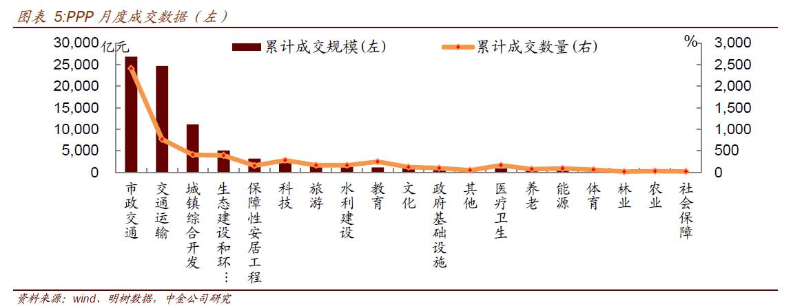 由于PPP有发改委和财政部两条线,财政部会定期发布季报披露PPP进展情况,但发改委数据披露不多;因而,我们觉得观察PPP月度中标规模,更能反映全市场的情况。从近期的数据来看,PPP月度成交规模目前在4000亿左右,且下半年活跃度明显高于上半年,或与87号文后,政府购买受限,部分政府购买项目转向采用PPP模式有关。