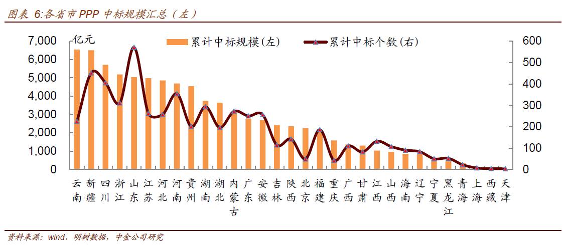 从分地区的成交来看,以云南和新疆的成交规模最大,累计中标规模超过6000亿;此外,四川、浙江、山东、江苏、河北、河南、贵州等地成交规模也相对偏高,观察可以发现,西南和华东地区采用PPP模式的项目较多,这主要在于西部地区基础设置建设较为落后,且财政实力薄弱,对PPP的依赖较强;而华东地区政府公共服务观念较好,在基础设施建设方面需求较强。