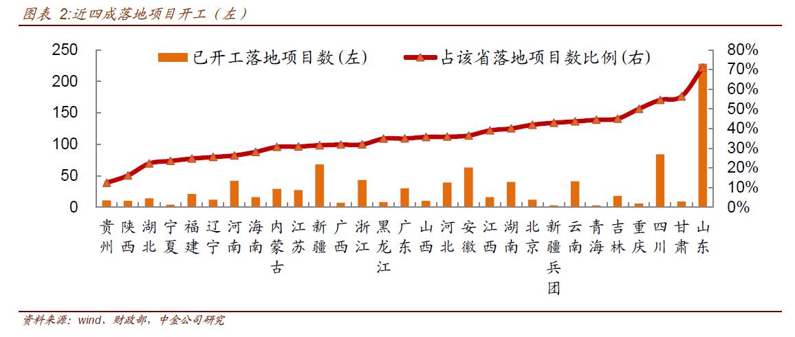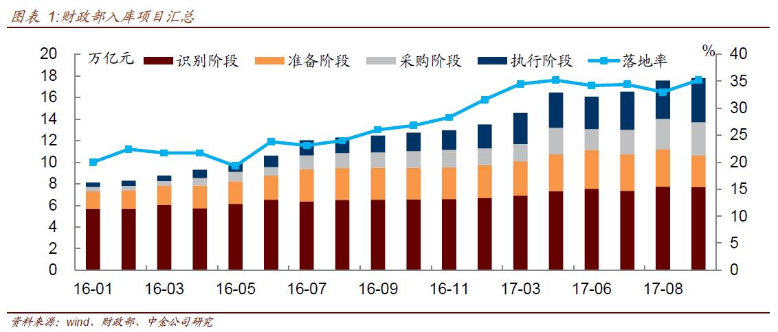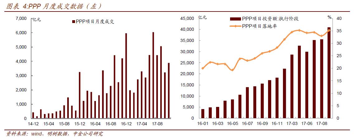入库只是PPP项目的起步,我们一般将进入执行阶段定义为项目落地。今年以来,随着各地PPP工作的推进,项目落地率有明显提升,从此前的20%左右提升至目前的35%左右。但落地并不等于开工,从财政部的最新季报数据来看,截至2017年9月末,总计落地2388个项目,已开工落地项目914个,占落地项目总数的38.3%。从金额来看,落地金额4.1万亿元,其中新增项目投资1.5万亿,占全年基建投资的比重在10%左右。