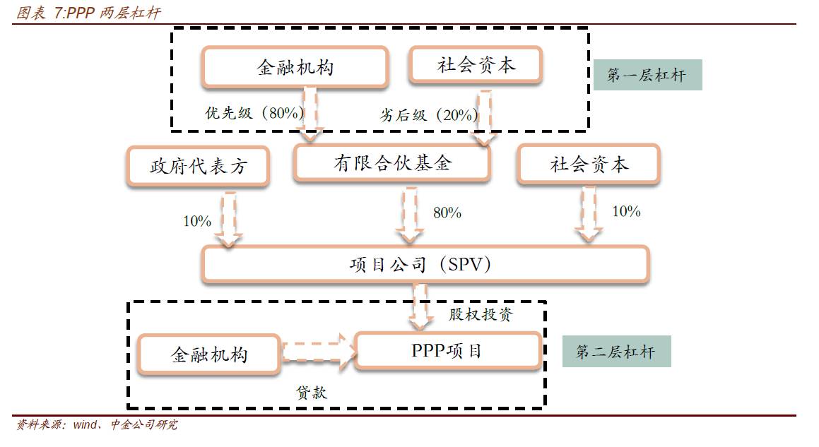 PPP项目之所以会带来债务风险,主要在于以少量的资本金撬动大规模投资,在实际中,PPP一般会涉及两层杠杆。第一层杠杆是项目的杠杆,在项目投资中,以少量资本金投资(一般在30%左右)撬动信贷。根据国务院《关于调整和完善固定资产投资项目资本金制度》,各类固定资产投资有最低的项目资本金比例要求,在20%-40%不等。比如,城市轨道交通、铁路和公路项目、保障性住房和普通商品住房为20%,港口、机场等为25%,煤炭为30%,钢铁、电解铝项目为40%。在目前落地的PPP项目中,资本金出资比例平均在30%左右。第二层杠杆是项目公司资金本的杠杆,财政部规定社会资本可以独自或者与政府共同成立特别目的公司进行公司建设和运营合作项目,但在实际中,一般也会引入金融机构参与项目公司股权投入;在这之中,银行等金融机构一般会约定固定收益回报或者以“对项目公司的股东借款”形式出现,形成第二层杠杆。即金融机构参与项目公司股权投资,但不承担股权风险,社会资本以少量资金充当劣后撬动金融机构股权投资。