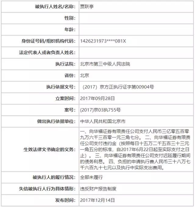 而3天后,12月14日,贾跃亭又一次被法院列入“老赖”名单。执行法院为北京市第三中级人民法院,执行依据文号为(2017)京方正执行证字第00904号。此次贾跃亭被列为“老赖”的案件涉及华福证券。