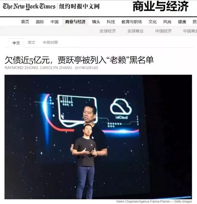 12月14日,纽约时报刊登了一篇题为《欠债近5亿元,贾跃亭被列入“老赖”黑名单》(China Names and Shames Tech Tycoon With Debt Blacklist)的文章。有人说,贾跃亭作为老赖名单第一人登上了《纽约时报》。