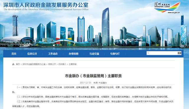 (三)负责完善深圳金融业整体布局,负责推进深圳金融改革创新综合试验区、金融功能区建设;指导、推进金融市场体系建设,促进多层次资本市场发展,引进金融机构及培育金融人才,促进金融发展。