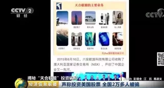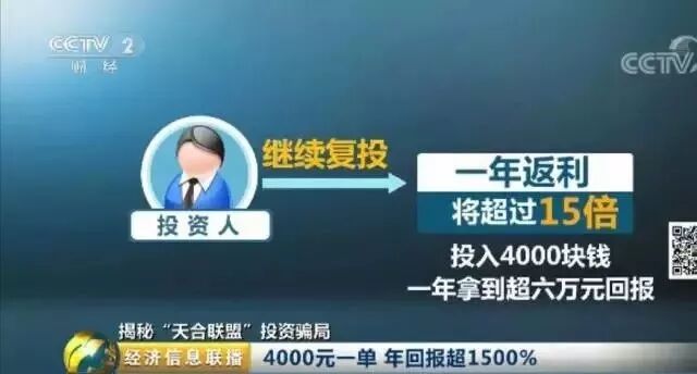 警方调查发现,投资人要想投资天合联盟,需要先花4000元购买资格,成为公司会员。成为会员后,就可以按照每份4000元的整数倍进行投资,投资期限为9周,每周按一定比例返利,如果投资人继续复投,一年返利将超过15倍,也就是投入4000块钱,一年能拿到超过六万元的回报。如果投资人在三个月之内,累计完成一百单,还可以申请成立报单中心,享受额外的分成。 合肥市公安局包河分局经侦大队民警 屈晓隆 告诉记者,嫌疑人成立报单中心之后,他的直接下线和间接下线,每投资一单都能获得160元的提成。 谓境外股票 无任何价值 投资4000块钱,9周就能获得巨额回报,这家天合联盟公司到底是做什么的?它有能力支付这么高的回报吗?所谓的美国纳斯达克股票,又是怎么回事呢? 天合联盟公司宣称,公司主要经营范围是航空旅游,代理销售机票,但警方调查发现,这完全是一个幌子。 合肥市公安局包河分局经侦大队民警 屈晓隆:发现整个在2016年,只有十几万元的飞机票销售额,对于这个20亿的资金流水来讲,这个十几万简直就是微乎其微。 除了这十几万的机票销售额之外,公司再没有任何实体业务,也没有一分钱的盈利。而所谓的在美国纳斯达克上市股票,在美国根本就没有人关注,也不能上市公开交易。 合肥市公安局包河分局经侦大队民警 屈晓隆:他所讲的这个天合控股公司,就是在美国纳斯达克上市的这家公司,没有任何实际价值,公司没有正常经营,没有营业,你想这个股价拉升会怎么拉升。 据警方介绍,几名嫌疑人从开始就知道资金链早晚会断裂,也做好了逃跑的准备。案发后,仅在其中一名嫌疑人家里,警方就搜获了上千万的现金。从2015年10月成立,到2016年4月崩盘,前后不过半年,天合联盟就吸收投资20个亿,平均每个月,都有3个亿的进账。 合肥市公安局包河分局经侦大队民警 屈晓隆:吸收资金额度到19.9亿元,这是一个非常恐怖的数字,结合我们这个案件一共涉及到2万多人看,每个人基本上都要投8万元以上的本金。 目前,几名涉案嫌疑人已经被合肥市包河区检察院提起公诉,案件正在进一步审查。 看不懂的股票 能看懂的骗局 和大多数骗局一样,天合联盟里炒作的是一个神乎其神的概念。但透过这个概念,我们看到其实这个骗局并不陌生,无非就是高额回报、短期内发横财。在这里,我们也再次提醒投资者,天下不会掉馅饼,高回报后面必有猫腻,真的不能相信。