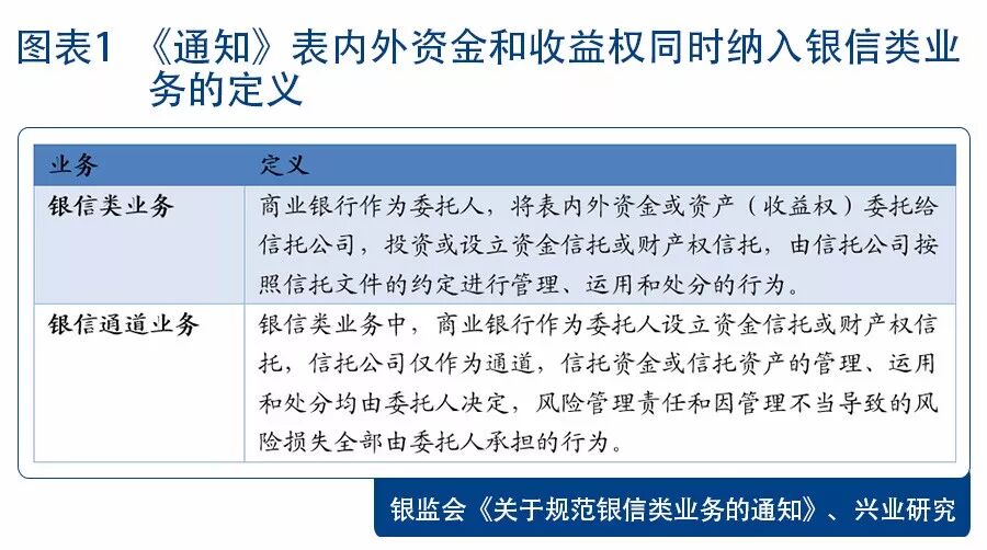 本次《通知》将银信类业务的定义扩大到表内外资金和收益权。此前,在银监发[2010]72号中,定义银信理财合作业务,是指“商业银行将客户理财资金委托给信托公司,由信托公司担任受托人并按照信托文件的约定进行管理、运用和处分的行为”,也就是仅包括了理财资金的委托。本次《通知》将银信类业务的定义扩大到“表内外资金或资产(收益权)”。