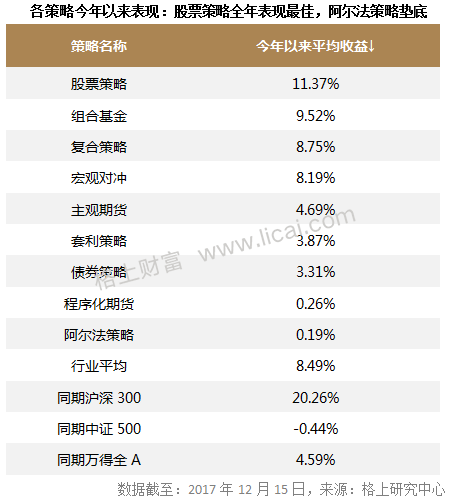 再过4个工作日,2017年就将收官,私募行业将交出怎样的成绩单?据格上研究中心统计,全年在白马股行情的带动下,股票型私募基金在各大策略中表现最为突出,截至12月15日全年平均获得11.37%的收益。其中,以价值投资为主线的私募机构表现更优,像景林资产、高毅资产等今年平均收益在50%左右。另外,受市场风格分化及负基差影响,阿尔法策略盈利困难,截至12月15日今年以来平均收益仅0.19%,在所有策略中表现垫底。