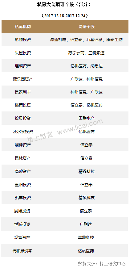 来源:格上研究中心【私募业绩】2017私募收官战冲刺,公募派为最大赢家,十年私募“老当益壮”【调研动向】私募扎堆医药生物行业,个股“亿帆医