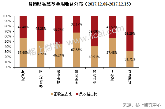 从各策略的业绩表现来看,上周(2017.12.08-2017.12.15)整体收益水平不高,行业平均收益为-0.11%,仅股票策略、组合基金与阿尔法策略取得周度正收益,位居首位的股票策略周度平均收益仅有0.29%。值得注意的是,上周组合基金策略的正收益占比最高,达67.83%,同时,管理期货策略仍然分化严重。
