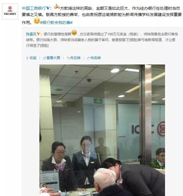 2017年12月26日,著名新闻史学家方汉奇24日宣布捐出100万奖金,助力新闻史研究工作,不过在其去银行网点转账汇款时,由于是学校的学生陪同教授前往汇款,银行很是担心是老人上当受骗,工行网点至少有三名工作人员向方汉奇了解转账汇款情况。网点员工在再三确认相关信息后,最终才为方老师办理了业务。只能说——“银行的警惕性最高啊!说起来这不正是负责的体现么?