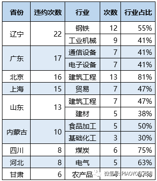 其中,来自辽宁省的企业以22次违约记录居于首位。广东、北京、山东、上海、内蒙古、江苏等地的债券违约次数均在10次以上。