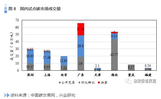 碳交易市场自2013年起,先后在全国8个地区开展试点。2017年试点市场合计成交量2.11亿吨,成交额48.1亿元。其中,二级市场成交量0.73亿吨,成交额12.2亿元,成交均价16.71元/吨。一、二级市场成交量较2016年分别上涨7.10%和7.07%。