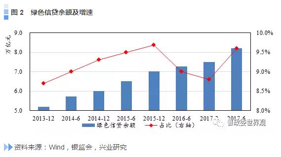 根据银监会新闻发布会披露的信息(这是目前所能得到的最新数据),截至2017年6月末,国内21家主要银行绿色信贷余额8.2万亿元,同比上涨12.9%,在各项贷款总余额中占比近10%[1]。由于绿色信贷有效地控制了环境风险,提升了企业和项目经营的可持续性,同时也是国家支持和鼓励的领域,因此资产质量较高。银监会披露数据显示,截至2016年6月末,21家主要银行业金融机构绿色信贷不良贷款余额226.25亿元,不良率为0.41%[2],远低于同期各项贷款1.76%的平均不良率。