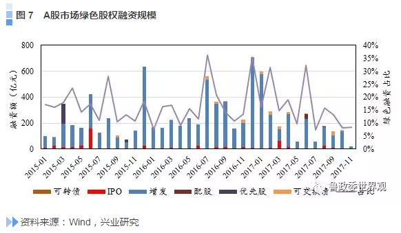 截至2017年末,A股市场绿色环保产业上市公司IPO、增发、配股、优先股、可转债与可交换债共融资2200亿元,比2016年同比下降18%。同期A股市场股权融资总额1.7万亿元,比2016年下降18.5%,融资规模降幅略低于总体,绿色股权融资在全市场融资中占比12.8%。