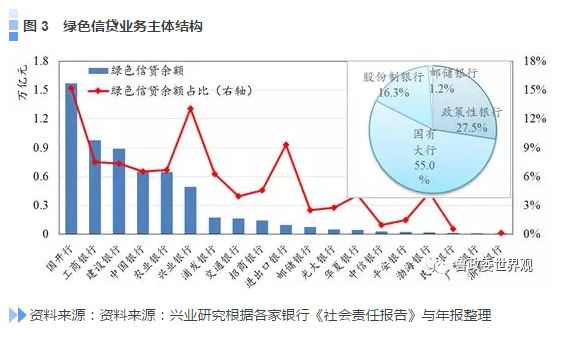 从信贷主体结构看,根据各行《社会责任报告》,2016年末五大国有银行绿色信贷余额占市场总额的55%,在各行信贷余额中的平均占比超过7%。股份制银行绿色信贷业务也有明显的增长,其中兴业银行保持一枝独秀,绿色信贷余额占比达到14%,仅次于国开行的15%,在所有商业银行中名列前茅。