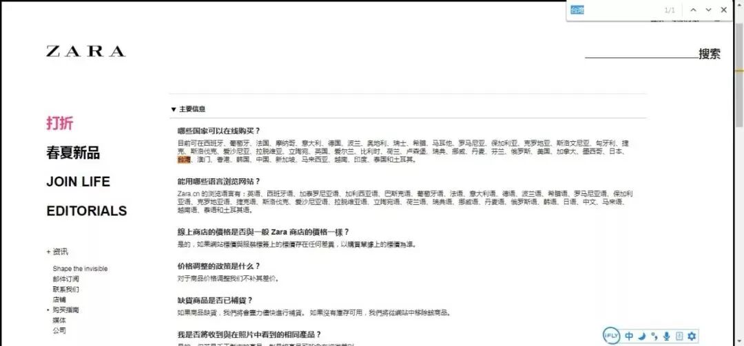 在知名服装品牌“ZARA”的中国官网上,也是将“台湾”表述为“国家”。