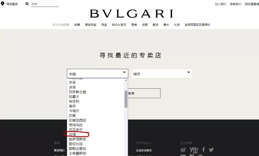 在宝格丽的中文官网上,寻找最近的专卖店的“选择国家”选项中,将“中国”与“台湾”并列。