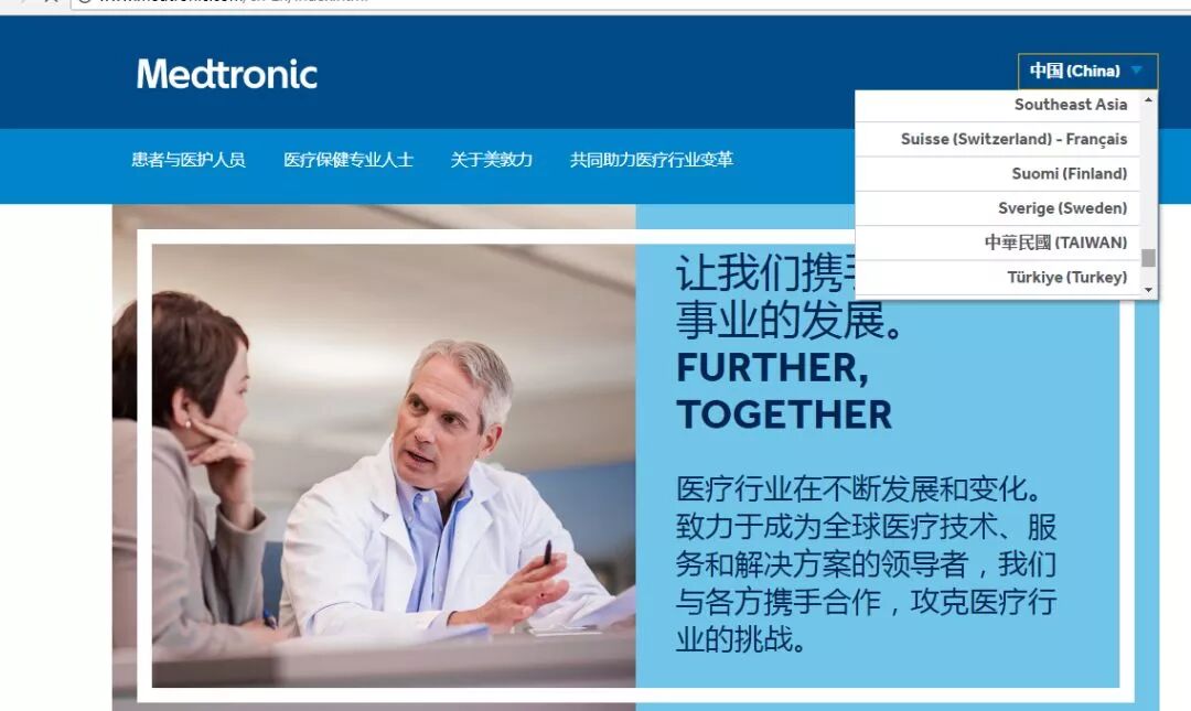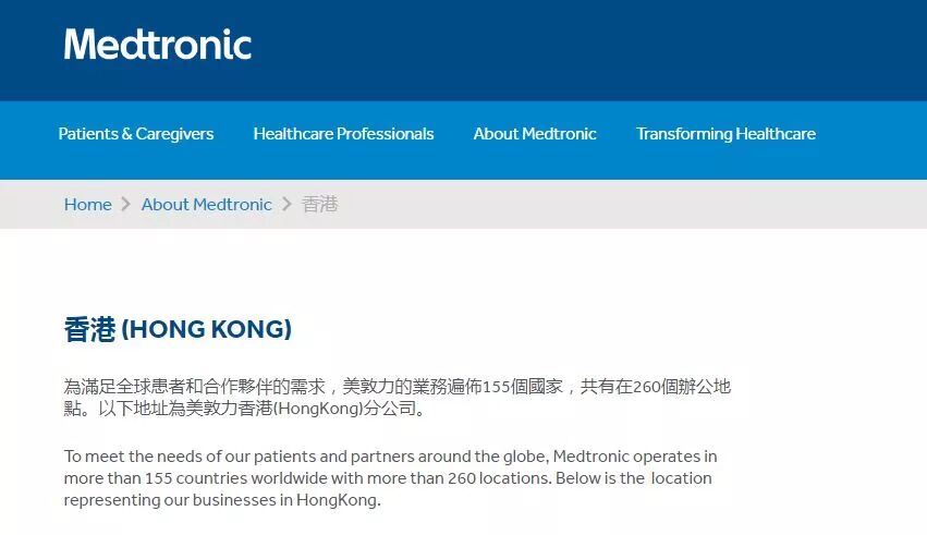 再如,美国医疗科技公司美敦力中文网站上,在右上角所在区域选项中,除了中国(China)外,还直接列出了“中华民国(Taiwan)”的选项,并在中国香港的官网下直接将香港表述为“国家”。