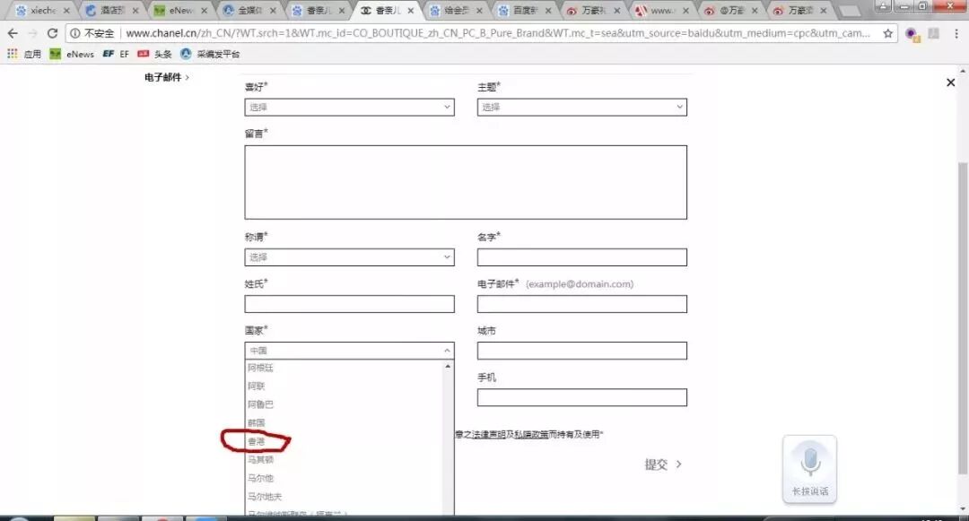 在香奈儿中文网站“联系我们”页面的“国家”选项中,将“中国“与“香港”并列。