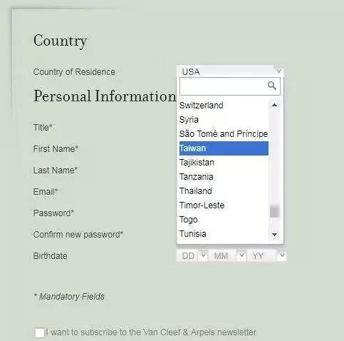 梵克雅宝也在其网站上采取类似做法,将“中国”和“台湾”都列入“国家”列表。