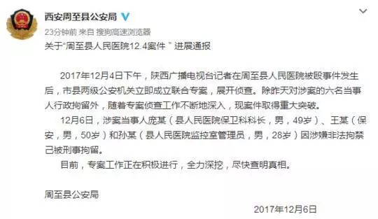 案件回顾 记者采访遭阻拦殴打并被关太平间 2015年11月19日,产妇喻娜娜在周至县人民医院(以下简称周至县医院)生下一名男婴后不幸去世。家属认为,医院在产妇死亡一事中存在过错,并将其诉诸法院。 2017年7月,西安市中级人民法院作出二审判决,判定周至县医院赔偿死者家属49.38万元人民币。随后经法院强制执行,家属拿到了这笔赔款。然而,当家属去医院打算取走产妇遗体安葬时,却被院方告知,要缴纳每日150元、总计10.2万元的尸体存放费用。 从2017年11月27日开始,陕西广播电视台《都市热线》栏目开始关注周至县医院“天价停尸费”一事。周至县医院副院长毛亚卫说,经周至县卫计局协调,考虑到死者家属的实际情况,2017年11月30日,死者丈夫王先律(化名)向医院缴纳1.5万元费用后,从太平间中取走了喻娜娜的遗体。 图为周至县人民医院太平间 一直追踪报道此事的陕西广播电视台记者说,他于2017年12月4日前往周至县医院采访,在出示本人记者证及单位介绍信后,表示需要求证相关事宜,不料遭到周至县医院有关领导所指使的十余位年轻男子的殴打。 随后,这些人又将他强行拖拽至保安室,并叫来太平间工作人员辛某共同对其拳打脚踢。他说,被打后又被强行拘禁在太平间内约20分钟,被放出后,对方叫来数人持手机对他拍照,还有人给他塞了2000元,让他“笑一笑”。 陕西省物价局:医院做法欠妥 周至县医院为二级甲等医院。按照陕西省物价局、原陕西省卫生厅印发的《陕西省医疗服务项目价格(2011版)》规定,二级医院尸体存放收费标准为每日最高限价20元。 陕西省物价局相关负责人2017年12月7日接受记者采访时介绍,按照相关规定,医院太平间分医院自主管理和民政部门接管两类,参照不同的收费标准。如果涉事医院的太平间还没有被民政部门接管,则收费标准应严格按照最新修订的《陕西省城市公立医院医疗服务项目价格(2017版)》的相关规定执行,即二级医院尸体存放每天最高限价24元。 这位负责人强调,无论是采取哪种方法存尸,都应该只有这一个标准,当地不应以“专门的冷藏柜保存”为由,出台另外的停尸收费标准。 这位负责人介绍,即便是民政部门已经接管了涉事医院的太平间,那么按照西安市的相关规定,非正常死亡的逝者尸体存放费用,也应以4元/小时的标准计算。“这样算也只有96元/天,150元/天的标准显然不妥。” 医院院长等12人被刑拘 2017年12月5日晚,周至县公安局、卫计局等部门发布通报称,陕西广播电视台记者采访被阻拦殴打一事发生后,周至县委、县政府立即召集公安、卫计等相关部门成立专项调查组,就事件展开调查,对相关人员依法依规进行严肃处理。 在初步调查基础上,周至公安部门2017年12月5日对6名涉案人员行政拘留。12月6日晚,周至县公安局通过官方微博发布“周至县人民医院12·4案件”进展通报,称“除昨天对涉案的6名当事人行政拘留外,随着专案侦查工作不断地深入,现案件取得重大突破。12月6日,涉案当事人庞某(县人民医院保卫科科长,男,49岁)、王某(保安,男,50岁)和孙某(县人民医院监控室管理员,男,28岁)因涉嫌非法拘禁已被刑事拘留。” 2017年12月7日晚,周至县公安局再度发布案件通报,称周至县人民医院院长李某某、原副院长刘某某及医院保安李某、张某某等4人涉嫌非法拘禁,于当日被依法刑事拘留;同时,根据最新调查取证,12月5日行政拘留的6人中有5人因涉嫌非法拘禁已依法予以刑事拘留。截至目前,共有12名涉案人员被刑事拘留,1名涉案人员被行政拘留。