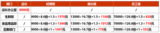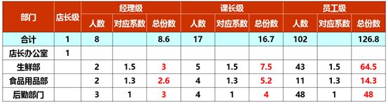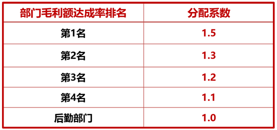 1、分配系数:按部门毛利达成率的排名情况,确定各部门对应分配系数。例如:某店生鲜部毛利达成率在该店四大营运部门中排名第1,生鲜部对应分配系数为1.5,即生鲜部的经理、经理助理、课长、员工的分配系数均为1.5。