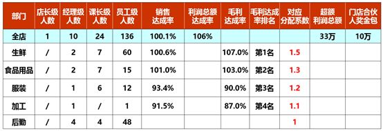 例如:卖场店A店第一季度,全店销售达成100.1%,利润总额达成106%,利润超额33万, 门店合伙人奖金包10万。以下为各部门人数、达成情况: