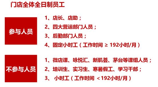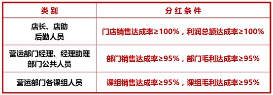 1、以门店为单位,以门店整体业绩任务达成作为参与分红的前提条件,从营运部门到后勤部门,从员工到店长均参与,体现全员参与,共同经营门店的目的。