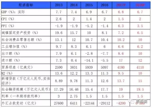 自2016年下半年以来全球主要经济体增长加快,2017年全球经济增速约为3.4%,2018年有望提升至3.7%左右。2018年世界经济将继续保持整体性复苏态势,为中国对外贸易和投资提供相对良好的外部环境。 发达国家经济增长有所加快,2017年经济增长2.1%左右,预计2018年增长2.4%。美国经济总体保持复苏步伐。经济促进计划逐渐落地,经济复苏带动就业、收入和资产价格增长。政策松动促进消费信贷增长,消费支出可能加快,并带动消费者价格指数上升至2%以上。预计2017年美国经济增长2.3%左右, 2018年进一步加快至2.7%左右。美联储一方面提高联邦基金利率,2018年可能会有2-3次加息;另一方面削减联邦储备银行的资产负债表,其外溢效应对国际市场的资本流动会进一步深化。欧洲经济继续改善,但依然面临诸多考验。2017年欧洲经济增长势头好于预期,投资规模扩大,工业产品价格恢复性上涨,融资环境转好;消费价格指数逐渐上升,已无通缩担忧。预计2017年欧盟经济增长2.1%左右,2018年可能加快至2.3%左右。英国脱欧、民粹主义、难民危机等问题仍将影响欧洲发展。欧盟成员国发展不平衡,不同国家在经济增长、债务水平、就业状况、社会福利等方面差距较大,导致分歧和摩擦继续存在,拖累欧盟经济增长步伐。日本经济内需不足,2018年经济增速可能持平。 在全球经济复苏、需求回暖、贸易增长的带动下,新兴市场经济体增长加快,国际收支状况改善。技术进步和革新带来全球产业价值链重构,新兴市场国家大都经历产业结构调整。预计2017年发展中国家经济增长4.3%左右,2018年加快至4.6%左右。全球贸易保护主义抬头,新兴经济体部分产品出口可能受到关税和非关税壁垒影响。美联储加息和美国减税引起美元走强预期,可能会加重新兴经济体货币贬值和资金流出压力。部分资本市场不完善、金融系统较脆弱、管控能力较低的新兴市场国家可能会出现局部的金融动荡。 2018年三驾马车的运行可能出现“一升一缓一稳”态势,即出口增速回升、投资增速放缓、消费增速平稳。 金融去杠杆、企业去杠杆、金融协调监管政策收紧等因素都会影响固定资产投资的资金来源,使投资增速承压。加强融资平台公司管理,清查利用PPP项目、各类投资基金变相举债,可能制约地方政府的融资能力,影响基建投资。调控政策收紧导致商品房销售、土地成交、建设开工、资金来源等相关指标均有所走弱,未来房地产开发投资增速可能放缓。但棚改、租赁住房建设及热点城市供地加速对开发投资形成支撑,房地产投资难以明显回落。制造业投资在出口回暖受动下继续回升。制造业投资结构转型,未来制造业投资有望平稳,但增速难以显著上升。预计2018年固定资产投资增速放缓至6.5%左右。 在小排量汽车退税政策退出以及新能源汽车补贴减少等政策影响下,汽车消费增速会有所放缓。同时房地产市场继续受到政策严格调控,销售会继续下降,从而影响住房相关消费增速。而居民收入增长、消费升级及养老改革等政策又会对消费形成支撑,预计2018年消费全年增速在10%左右。 在世界经济持续复苏的带动下出口增速会继续上升。全球几大主要贸易伙伴和新兴市场经济国家的改善将继续有利于中国出口的增长,预计2018年中国出口增速高于2017年,达到10%左右。 2017年CPI持续在2%以下运行,保持低通胀状态。未来经济增长总体上平稳,国内需求难以大幅上升;随着去杠杆、防风险和监管政策趋紧,市场利率小幅上行,流动性不会大幅释放,2018年难以出现较大的通胀压力。食品和非食品价格走势分化,食品价格走弱,2017年2月以来持续为负;而非食品价格逐渐上升,同比涨幅从2016年初1%左右缓慢上涨至目前2.5%左右的水平。2018年食品价格可能恢复性回正,猪肉价格迎来上行周期,成为推动CPI上升的主要因素。由于2016年以来工业领域产品价格显著上涨,从2017年下半年开始逐渐从上游向中游传导、从生产资料向生活资料传导,2018年价格涨势可能会从生产端向消费端转移。 2017年PPI涨势将分化,生产资料价格波动大,生活资料运行平稳;上游行业价格涨幅大,中下游行业价格波动较小。在不出现外部冲击的情况下,大宗商品价格难以持续大幅上升,未来输入性因素对PPI的抬升作用减弱。在国内投资需求趋弱的情况下,2018年工业产品价格上涨步伐将会放缓,PPI难以重拾大幅攀升之势。前期价格上涨较大的上游产业难以进一步飙升走高,部分行业价格可能出现回调。价格涨势从上游向中下游传导,2018年中游和下游行业产品价格可能有阶段性上行。由于去产能工作持续推进,环保限产力度加大,对产品价格形成支撑,与钢铁、水泥等去产能力度较大的工业行业产品价格短期不会明显回落,涨势可能维持。 经测算,2018年CPI翘尾因素月平均为0.9%左右,高于2017年,呈上半年高、下半年低特点,高点出现在年中6、7月份。综合判断,2018年CPI上涨2%左右,高于2017年。预计2018年PPI翘尾因素月平均为2.4%,显著低于2017年,高点出现在1月和6-8月。综合判断,2018年PPI平均涨幅3.5%左右,低于2017年。CPI和PPI之间的剪刀差逐渐收窄,物价水平较为温和。 2018年,信贷增速将稳中缓降,房地产调控带来的居民中长期贷款增速放缓、地方债置换重新提速对企业贷款的下沉效应都可能是影响信贷增速的重要因素。而在市场利率的上升和监管趋严进程中所出现的表外融资向