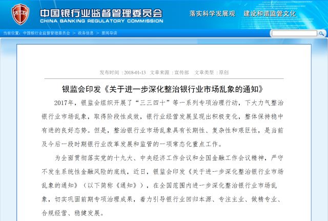 2017年以来,银监会开展了“三三四十”等一系列整治银行业市场乱象的行动,取得了不少成果。但乱象整治不是一蹴而就的,而是项永久工程。所以,银监会升级了原来的整治工作,把前前后后各种整治要求,汇总梳理成了《关于进一步深化整治银行业市场乱象的通知》(银监发〔2018〕4号),袭击了这个周末。