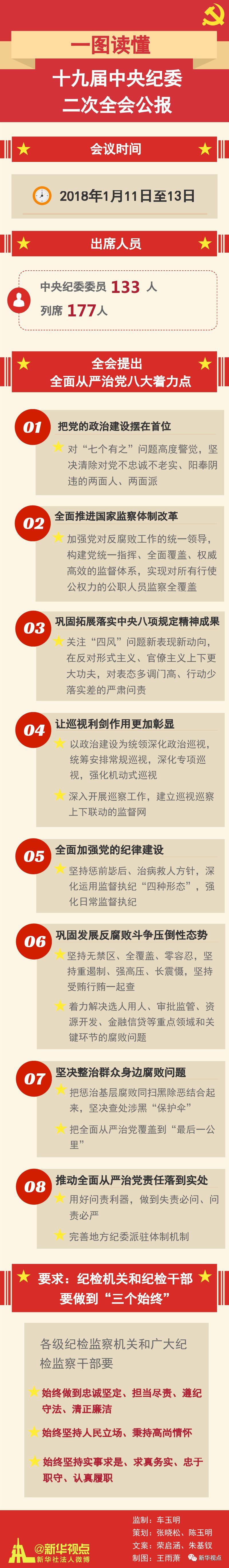 中国共产党第十九届中央纪律检查委员会第二次全体会议,于2018年1月11日至13日在北京举行。出席这次全会的有中央纪委委员133人,列席177人。