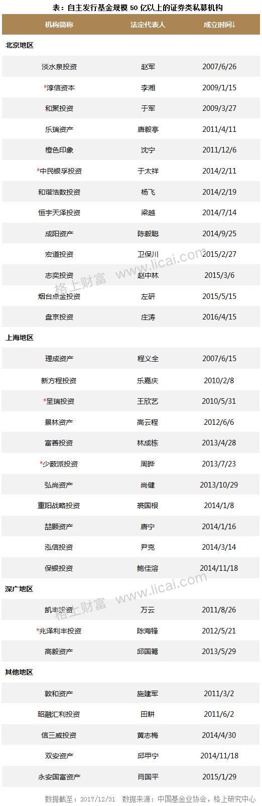 基金业协会备案数据显示,截至2017年四季度末,自主发行基金规模在50亿以上的证券类私募管理人共32家,75%的机构集中于北京(13家)和上海(11家)两地。本季度新晋自主发行规模50亿以上私募机构共有5家,包括淳信资本、中民银孚投资、呈瑞投资、少薮派投资和兆泽利丰投资;本季度退出50亿机构名单的机构共有3家,包括磐信投资、海银资产和昌都凯丰投资。