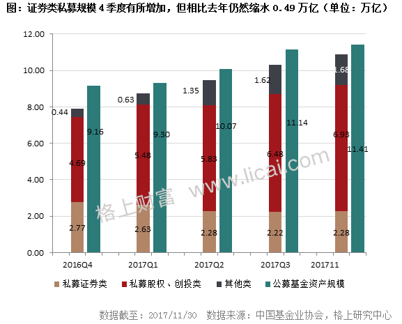 基金业协会备案数据显示,截至11月底,私募基金行业管理规模为10.90万亿,较上一季度环比增加0.58万亿,较2016年末增长了3.01万亿,增幅约38.15%。其中除证券类私募规模同比缩减0.49万亿以外,股权、创投、其他类私募实缴规模相比2016年末均有所增加。